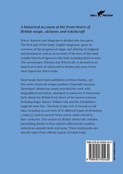 A historical account of the front-liners of British magic, alchemy and witchcraft Witch, Warlock and Magician is divided into two parts. The first part of the book, English Magicians, gives an overview of the progress of magic and alchemy in England and Scotland as well as an account of the lives of the most notable historical figures in this field, including Rosicrucians. The second part, Witches and Witchcraft, is devoted to an historical review of witchcraft in Britain and some of the most important witch-trials. More books have been published on these themes, yet this work retains its unique position. Especially because Davenport Adams has amply provided his work with biographical anecdotes, abundant in unknown or humorous facts about the British front-liners of the secret sciences, including Roger Bacon, William Lilly and the Elizabethan magician John Dee. The book is also rich in factual occult data, including an overview of 15 different types of divination (..mancy), used in ancient times and to some extend in later centuries. The section on British witchcraft contains fascinating details on how witches affected the weather, entered an animal's body and more. These testimonies are directly taken from official reports of witch trials. Post Scriptum with biography of the author included.