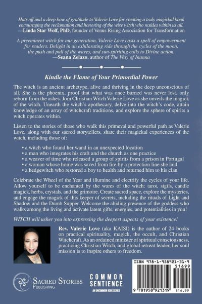 Kindle the Flame of Your Primordial Power The witch is an ancient archetype, alive and thriving in the deep unconscious of all. She is the phoenix, proof that what was once burned was never lost, only reborn from the ashes. Join Christian Witch Valerie Love as she unveils the magick of the witch. Unearth the witch's apothecary, delve into the witch's code, attain knowledge of an array of witchcraft traditions, and explore the sphere of spirits a witch operates within. Listen to the stories of those who walk this primeval and powerful path as Valerie Love, along with our sacred storytellers, share their magickal experiences of the witch, including those of:a witch who found her wand in an unexpected location a man who integrates his craft and the church as one practice a weaver of time who released a group of spirits from a prison in Portugal a woman whose home was saved from fire by a protection line she laid a hedgewitch who restored a boy to health and returned him to his clan Celebrate the Wheel of the Year, and illumine and electrify your cycles of life. Allow yourself to be enchanted by the wares of the witch: tarot, sigils, candle magick, herbs, crystals, and the grimoire. Create sacred space, explore the mysteries, and engage the magick of this keeper of secrets, including the rituals of Light and Shadow and the Dumb Supper. Welcome the abiding presence of the goddess who walks among the living and activate latent gifts, energies, and potentialities in you! WITCH will usher you into expressing the deepest aspects of your existence! WITCH: Divine Alignments with the Primordial Energies of Magick and Cycles of Nature is part of Common Sentience, an uncommon book series that brings the mystical into the mainstream by sharing spiritual wisdom and true, personal stories of the Divine experiences many are having. Look for other books in this exciting series at sacredstories.com.