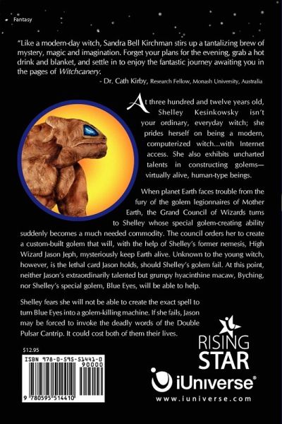 Three hundred and twelve years old, Shelley Kesinkowsky isn't your ordinary, everyday witch; she prides herself on being a modern, computerized witch who has Internet access. She also demonstrates uncharted talents in constructing golems-virtually alive, human-type beings. When planet Earth faces trouble from the fury of the golem legionnaires of Mother Earth, the Grand Council of Wizards turns to Shelley, whose special golem-creating ability suddenly becomes a much needed commodity. The council orders her to create a custom-built golem that will, with the help of Shelley's former nemesis, High Wizard Jason Jeph, mysteriously keep Earth from destruction. Unknown to the young witch, however, is the lethal card Jason holds should Shelley's golem fail. At this point, neither Jason's extraordinarily talented but grumpy hyacinthine macaw, Byching, nor Shelley's special golem, Blue Eyes, will be able to help. Shelley fears she will not be able to create the exact spell to turn Blue Eyes into a golem-killing machine. If she fails, Jason may be forced to invoke the deadly words of the Double Pulsar Cantrip. That could cost both of them their lives.