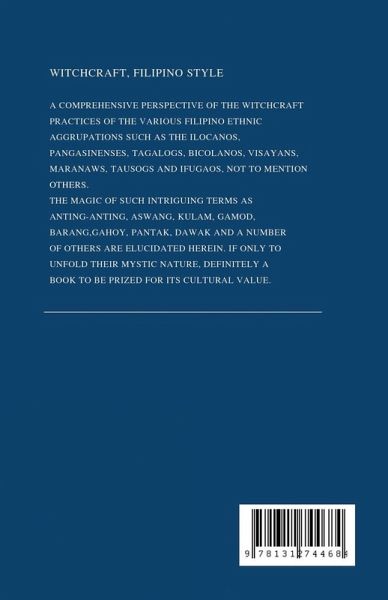 A comprehensive perspective of the witchcraft practices of the various Filipino ethnic groups such as the Ilocanos, Pangasinenses, Tagalogs, Bicolanos, Visayans, Maranaws, Tausogs and Ifugaos, not to mention others. The magic of such intriguing terms as anting-anting, aswang, kulam, gamod, barang, gahoy, pantak, dawak and a number of others are explored within. If only to unfold their mystic nature, definitely a book to be prized for its cultural value.