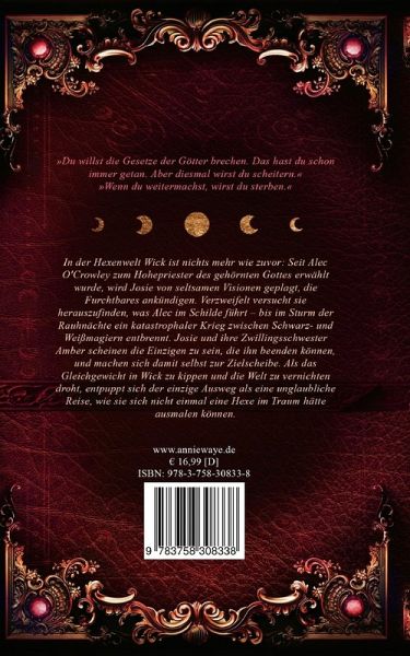 »Du willst die Gesetze der Götter brechen. Das hast du schon immer getan. Aber diesmal wirst du scheitern.«»Wenn du weitermachst, wirst du sterben.«In der Hexenwelt Wick ist nichts mehr wie zuvor: Seit Alec O'Crowley zum Hohepriester des gehörnten Gottes erwählt wurde, wird Josie von seltsamen Visionen geplagt, die Furchtbares ankündigen. Verzweifelt versucht sie herauszufinden, was Alec im Schilde führt - bis im Sturm der Rauhnächte ein katastrophaler Krieg zwischen Schwarz- und Weißmagiern entbrennt. Josie und ihre Zwillingsschwester Amber scheinen die Einzigen zu sein, die ihn beenden können, und machen sich damit selbst zur Zielscheibe. Als das Gleichgewicht in Wick zu kippen und die Welt zu vernichten droht, entpuppt sich der einzige Ausweg als eine unglaubliche Reise, wie sie sich nicht einmal eine Hexe im Traum hätte ausmalen können.Das epische Finale der "Witches of Wick"-Trilogie von Annie Waye. Für Fans von Supernatural, Chilling Adventures of Sabrina, magischen Fantasy-Jugendbüchern, humorvoller Young Adult Fantasy, Portalfantasy, der Wicca-Mythologie und Büchern mit Irland- / Kelten-Setting.