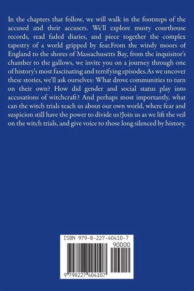 In the chapters that follow, we will walk in the footsteps of the accused and their accusers. We'll explore musty courthouse records, read faded diaries, and piece together the complex tapestry of a world gripped by fear.From the windy moors of England to the shores of Massachusetts Bay, from the inquisitor's chamber to the gallows, we invite you on a journey through one of history's most fascinating and terrifying episodes.As we uncover these stories, we'll ask ourselves: What drove communities to turn on their own? How did gender and social status play into accusations of witchcraft? And perhaps most importantly, what can the witch trials teach us about our own world, where fear and suspicion still have the power to divide us?Join us as we lift the veil on the witch trials, and give voice to those long silenced by history.