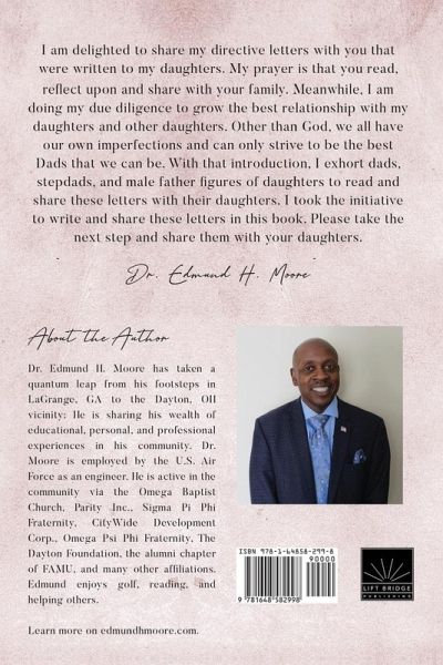 I am delighted to share my directive letters with you that were written to my daughters. My prayer is that you read, reflect upon, and share with your family. Meanwhile, I am doing my due diligence to grow the best relationship with my daughters and other daughters. Other than God, we all have our own imperfections and can only strive to be the best Dads that we can be. With that introduction, I exhort dads, stepdads, and male father figures of daughters to read and share these letters with their daughters. I took the initiative to write and share these letters in this book. Please take the next step and share them with your daughters.