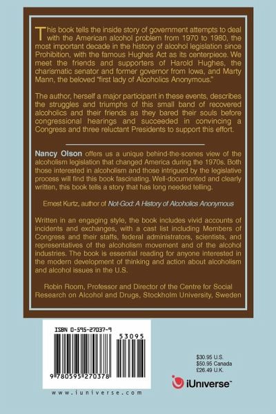 This book tells the fascinating inside story of the period from 1970 to 1980, the most important decade in the history of alcohol legislation since Prohibition, with the famous Hughes Act as its centerpiece. We meet Harold Hughes, the charismatic senator and former governor from Iowa, a recovered alcoholic himself, and Marty Mann, the beloved "first lady of Alcoholics Anonymous" and founder of the National Council on Alcoholism. We meet Bill Wilson, the co-founder of A.A., and we hear him deliver his historic testimony before a Senate committee. The author, a participant in all she describes, gives us a behind-the-scenes look at this band of recovered alcoholics as they bared their souls before congressional hearings and succeeded in convincing a Congress and three reluctant Presidents of the United States to support this effort. We meet Academy Award winning actress Mercedes McCambridge, Senator Harrison Williams, Ways and Means chairman Wilbur Mills, and many others. This was the activist wing of the Twelve Step movement, so rarely acknowledged in spite of the enormous impact it has had. And she describes the many non-alcoholics who courageously supported them, like Senators Edward M. Kennedy, Strom Thurmond, John Stennis, Orin Hatch, along with Captain Joe Zuska who founded the Navy's treatment center at which Betty Ford, the wife of President Ford, later sought help.