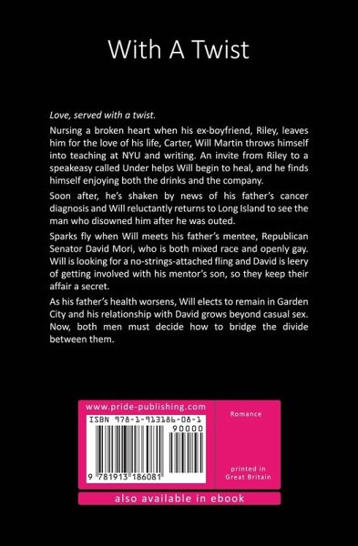Love, served with a twist. Nursing a broken heart when his ex-boyfriend, Riley, leaves him for the love of his life, Carter, Will Martin throws himself into teaching at NYU and writing. An invite from Riley to a speakeasy called Under helps Will begin to heal, and he finds himself enjoying both the drinks and the company. Soon after, he’s shaken by news of his father’s cancer diagnosis and Will reluctantly returns to Long Island to see the man who disowned him after he was outed. Sparks fly when Will meets his father’s mentee, Republican Senator David Mori, who is both mixed race and openly gay. Will is looking for a no-strings-attached fling and David is leery of getting involved with his mentor’s son, so they keep their affair a secret. As his father’s health worsens, Will elects to remain in Garden City and his relationship with David grows beyond casual sex. Now, both men must decide how to bridge the divide between them.