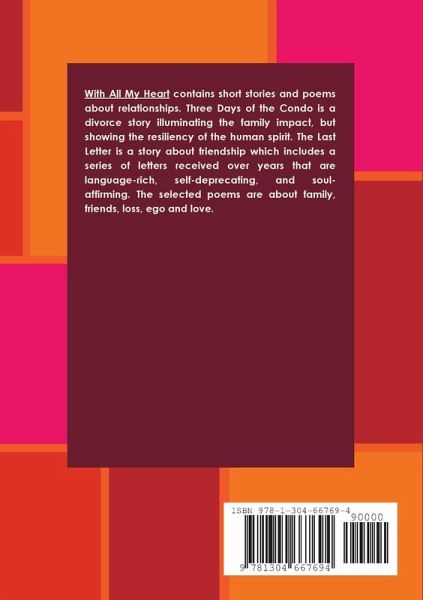 The book contains two short stories, one about a divorce and one about friendship and loss. The selected poems are life-affirming and center around relationships.