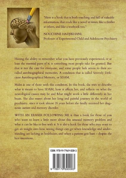 Having the ability to remember what you have previously experienced, or at least the essential parts of it, is something most people take for granted. But that is not the case for everyone, and some people lack access to their so-called autobiographical memories. A condition that is called Severely Deficient Autobiographical Memory, or SDAM.Malin is one of those with this condition. In this book, she tries to describe what it means to have SDAM, how it affects her, and reflects on what the neurological causes may be and what might work a little differently in her brain. She also muses about her long and painful journey in the world of psychiatry, since it took almost 28 years before she finally received her diagnosis: autism and memory disorder.WITH AN ERASER FOLLOWING ME is thus a book for those of you who want to learn a little more about this unusual memory problem and what it can be like to live with it. It is also a book for those who may want to get an insight into how wrong things can go when knowledge and understanding are lacking in healthcare, and when a patient gets hurt, despite the best intentions."Here is a book that is both touching and full of valuable information, that reads like a novel at times, like a thriller at others, and like a textbook too."NOUCHINE HADJIKHANIProfessor of Experimental Child and Adolescent Psychiatry atSahlgrenska Academy at Gothenburg University. Associate Professor at Harvard Medical School, Boston.