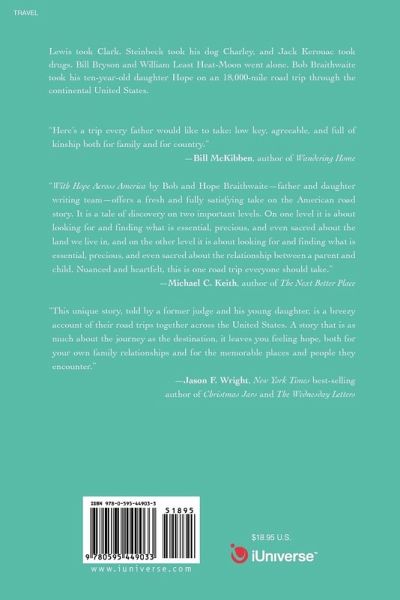 Lewis took Clark, Steinbeck took his dog Charley, and Kerouac took drugs. Bill Bryson and William Least Heat-Moon went alone. Bob Braithwaite took Hope, his ten-year-old daughter, on an 18,000-mile road trip through the continental United States. The plan was simple: to see the country together-its monuments and natural wonders, its museums and quirky tourist traps. And they did all that-lunched at the White House, kayaked the Salmon River, visited the baseball and basketball halls of fame, and booked a night in an Oregon tree house. Together, a father and his daughter experienced the claustrophobic terror triggered by a ride to the top of the St. Louis Arch, the reverence inspired by a Civil War battlefield, and the delight in the witty (and passive-aggressive) personalities displayed by Hope's traveling menagerie of stuffed animals. Yet everything they learned about history, geography, sports, and their fellow Americans was nothing compared to what they learned about being with one another and enjoying the simple pleasures life offers. With Hope Across America: A Father-Daughter Journey chronicles the Braithwaites' experiences from the redwood forests to the gulf-stream waters, as well as the unexpected adventures of their hearts and minds.