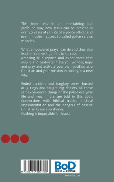 This book tells in an entertaining but profound way how Jesus can be present in over 40 years of service of a police officer and even miracles happen. So-called police-service miracles.What empowered prayer can do and thus also lead police investigations to success.Amazing true reports and experiences that inspire and motivate, make you wonder, hope and pray, and activate your own position as a Christian and your mission in society in a new way.Ended accident and burglary series, busted drug rings and caught big dealers, all these self-experienced things of the police everyday life and much more, are told in this book. Connections with biblical truths, practical implementation and the dangers of passive Christianity are also shown.Nothing is impossible for Jesus!