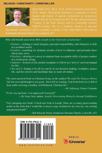 The University of Adversity presents thirty-two timeless and life changing lessons for successful living, drawn from the discouragements and hardships of Joseph the Hebrew in Egypt (Mizraim). These principles cover topics such as effective parenting, money-management, personal relationships and prayer. The University of Adversity is a 'how to' manual for practical living in a sinful world. These principles have been tried, tested and proven effective for nearly three thousand years, and are just as relevant today as they were in the life of Joseph. What worked for Joseph will work today. Who will benefit most from The University of Adversity? Parents--seeking sound biblical keys to teaching integrity and personal responsibility, and raising children with character and conscience in a troubled world. Leaders--searching for dynamic models of how to influence and persuade those whom they serve--even through adverse circumstances. Teachers--desiring to convey to students basic acceptable skills of proper conduct in a world gone wrong. Students--in need of role-model exemplars to follow in a 'how to' survival manual for life. You and I--hoping to be all we can be in our decision-making, workplace, prayer life, and the sorrows and hardships that we must all endure.