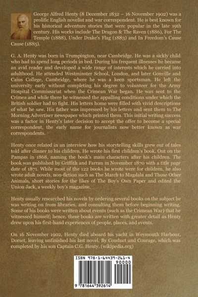 George Alfred Henty (8 December 1832 – 16 November 1902) was a prolific English novelist and war correspondent. He is best known for his historical adventure stories that were popular in the late 19th century. His works include The Dragon & The Raven (1886), For The Temple (1888), Under Drake's Flag (1883) and In Freedom's Cause (1885). G. A. Henty was born in Trumpington, near Cambridge. He was a sickly child who had to spend long periods in bed. During his frequent illnesses he became an avid reader and developed a wide range of interests which he carried into adulthood. He attended Westminster School, London, and later Gonville and Caius College, Cambridge, where he was a keen sportsman. He left the university early without completing his degree to volunteer for the Army Hospital Commissariat when the Crimean War began. He was sent to the Crimea and while there he witnessed the appalling conditions under which the British soldier had to fight. His letters home were filled with vivid descriptions of what he saw. His father was impressed by his letters and sent them to The Morning Advertiser newspaper which printed them. This initial writing success was a factor in Henty's later decision to accept the offer to become a special correspondent, the early name for journalists now better known as war correspondents. Henty once related in an interview how his storytelling skills grew out of tales told after dinner to his children. He wrote his first children's book, Out on the Pampas in 1868, naming the book's main characters after his children. The book was published by Griffith and Farran in November 1870 with a title page date of 1871. While most of the 122 books he wrote were for children, he also wrote adult novels, non-fiction such as The March to Magdala and Those Other Animals, short stories for the likes of The Boy's Own Paper and edited the Union Jack, a weekly boy's magazine. Henty usually researched his novels by ordering several books on the subject he was writing on from libraries, and consulting them before beginning writing. Some of his books were written about events (such as the Crimean War) that he witnessed himself; hence, these books are written with greater detail as Henty drew upon his first-hand experiences of people, places, and events. On 16 November 1902, Henty died aboard his yacht in Weymouth Harbour, Dorset, leaving unfinished his last novel, By Conduct and Courage, which was completed by his son Captain C.G. Henty. Henty is buried in Brompton Cemetery, London. (wikipedia.org)