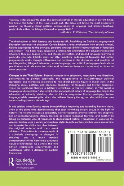 The third edition of With Literacy and Justice for All: Rethinking the Social in Language and Education continues to document Carole Edelsky's long involvement with socially critical, holistic approaches to the everyday problems and possibilities facing teachers of language and literacy. This book helps education professionals understand the educational/societal situations they are dealing with, and literacy instruction and second language learning in particular contexts. Edelsky does not offer simplistic pedagogical formulas, but rather, progressively works through differences and tensions in the discourses and practices of sociolinguistics, bilingual education, whole language, and critical pedagogy--fields whose practitioners and advocates too often work in isolation from each other and, at times, at cross purposes. In this edition, what Edelsky means by rethinking is improving and extending her own views, while at the same time demonstrating that such rethinking always occurs in the light of history. The volume includes a completely new Introduction and two entirely new chapters: one on reconceptualizing literacy learning as second language learning, and another on taking a historical view of responses to standardized testing. Throughout, in updating the volume, Edelsky uses a variety of structural styles to note contrasts in her views across time and to make the distinction clear between the original material and the current additions. This edition is a rare example of a scholarly owning-up to changes in thinking, and a much needed demonstration of the historically grounded nature of knowledge. As a whole, the third edition emphasizes recursiveness and questioning within a deliberately political framework.