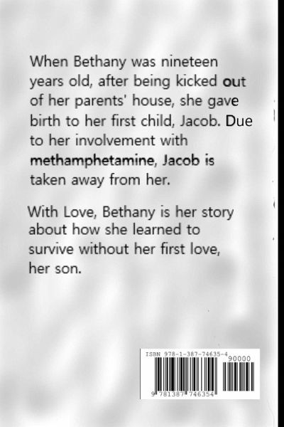 When Bethany was nineteen years old, after being kicked out of her parents' house, she gave birth to her first child, Jacob. Due to her involvement with Methamphetamine, Jacob is taken away from her. With Love, Bethany is the prequel to Lethal Quantities and tells us Bethany's story as she tries to go on with her life after losing her one true love; her son.