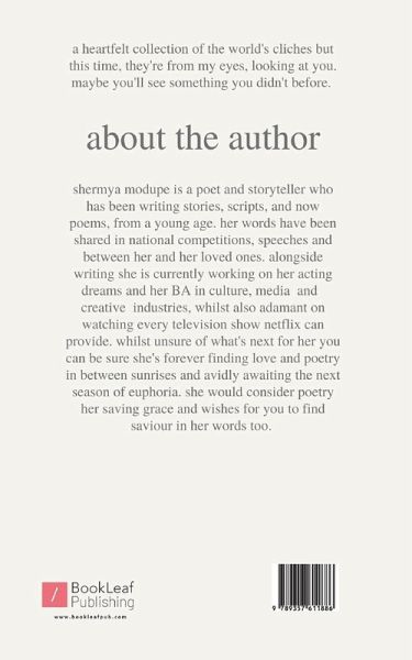 shermya modupe is a poet and storyteller who has been writing stories, scripts, and now poems, from a young age. her words have been shared in national competitions, speeches and between her and her loved ones. alongside writing she is currently working on her acting dreams and her BA in culture, media and creative industries, whilst also adamant on watching every television show netflix can provide. whilst unsure of what's next for her you can be sure she's forever finding love and poetry in between sunrises and avidly awaiting the next season of euphoria. she would consider poetry her saving grace and wishes for you to find saviour in her words too.