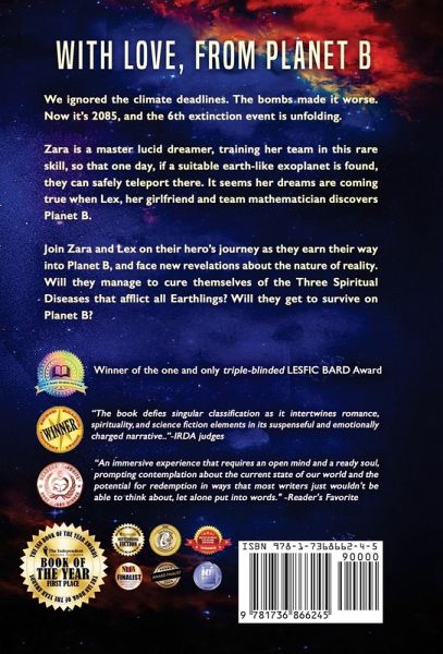 WINNER of Grand Prize First Place: Fiction book of the year. IAN Awards WINNER of the Triple blinded LESFIC BARD Award - Science Fiction WINNER of the IRDA Indie Reader Discovery Award - Environment WINNER of the Gold medal in The Global E-Book Awards - Metaphysical/Spiritual. WINNER of the Bronze medal in the Reader's Favorite Award - Inspirational FINALIST of Next Gen Indie Book Award, the National Indie Excellence Award, the International Book Awards and more... --------------------------- It's 2085, and the 6th extinction event is unfolding. Zara is a master lucid dreamer, training her team in this rare skill, so that one day, if a suitable earth-like exoplanet is found, they can safely teleport there. It seems her dreams are coming true when Lex, her girlfriend and team mathematician discovers Planet B. But Planet B won't let anyone enter... Join Zara and Lex on their hero's journey as they go within to find their real selves, and face new revelations about reality. Will they manage to cure themselves of the Three Spiritual Diseases that afflict all Earthlings? Will they get to survive on Planet B? ---------------------------- "The work is an immersive experience that requires an open mind and a ready soul, prompting contemplation about the current state of our world and the potential for redemption in ways that most writers just wouldn't be able to think about, let alone put into words." - Reader's Favorite, 5/5 stars
