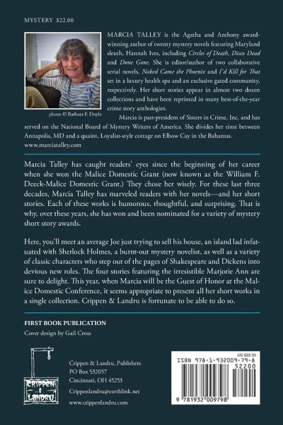 Marcia Talley has caught readers' eyes since the beginning of her career when she won the Malice Domestic Grant (now known as the William F. Deeck-Malice Domestic Grant.) They chose her wisely. For these last three decades, Marcia Talley has marveled readers with her novels-and her short stories. Each of these works is humorous, thoughtful, and surprising. That is why, over these years, she has won and been nominated for a variety of mystery short story awards. Here, you'll meet an average Joe just trying to sell his house, an island lad infatuated with Sherlock Holmes, a burnt-out mystery novelist, as well as a variety of classic characters who step out of the pages of Shakespeare and Dickens into devious new roles. The four stories featuring the irresistible Marjorie Ann are sure to delight. This year, when Marcia will be the Guest of Honor at the Malice Domestic Conference, it seems appropriate to present all her short works in a single collection. Crippen & Landru is fortunate to be able to do so.