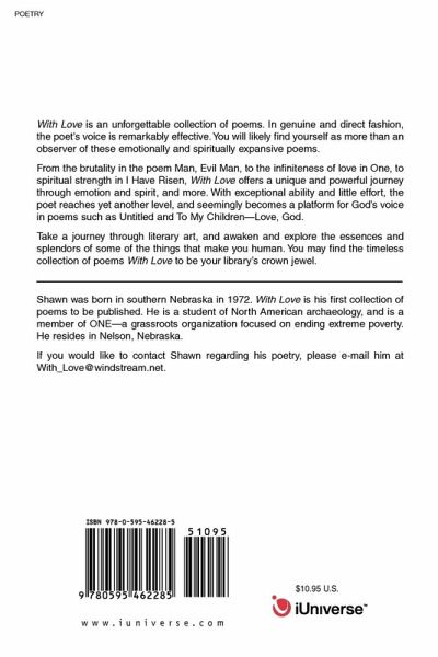 With Love is an unforgettable collection of poems. In genuine and direct fashion, the poet's voice is remarkably effective.You will likely find yourself as more than an observer of these emotionally and spiritually expansive poems. From the brutality in the poem Man, Evil Man, to the infiniteness of love in One, to spiritual strength in I Have Risen, With Love offers a unique and powerful journey through emotion and spirit, and more. With exceptional ability and little effort, the poet reaches yet another level, and seemingly becomes a platform for God's voice in poems such as Untitled and To My Children-Love, God. Take a journey through literary art, and awaken and explore the essences and splendors of some of the things that make you human. You may find the timeless collection of poems With Love to be your library's crown jewel.