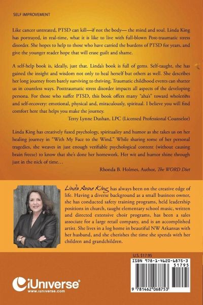 Like cancer untreated, PTSD can kill-if not the body- the mind and soul. Linda King has portrayed, in real-time, what it is like to live with full-blown post-traumatic stress disorder. With My Face to the Wind is not only for those who have PTSD, or those who support friends and family with PTSD, but it is also for professionals who want a window into the mind and heart of someone struggling to overcome PTSD. With this 2021 revision, Linda hopes that readers who have lived with the symptoms of this disorder (which often goes undiagnosed) will learn coping skills, along with hope and faith to continue on their journey. Linda King's "With My Face to the Wind" is an inspiring read like no other. Her story is one of the tragedies and triumphs, with tears and laughter guiding the way. Mrs. King knows how to tell her tales and pushes her readers to better themselves-by accepting themselves. I suggest this book to anyone-PTSD suffers, mis-understood teenagers, and those who are perfectly fine. This book will lead you to your best self. -Anna Katherine Beerman While sharing some of her personal tragedies, Linda King weaves just enough verifiable psychological content (without causing brain freeze) to know that she's done her homework. Her wit and humor shine through just in the nick of time. . . -Rhonda B. Holmes, Author, The WORD Diet What you have written is too powerful to be read in one or two settings. As a registered nurse I've been accustomed to reading professional abstracts and journals quickly and incorporating new learning into my nursing practice. It was the unanticipated emotional impact that caused me to read it in small "doses" spread over a couple of months. . . . and your format of introducing that information throughout the book as it coincided with stages in your own emotional journey, will make it much easier for individuals affected by PTSD to understand and apply it to their own circumstances. -Elen Wright, R.N
