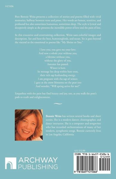Poet Bonnie Weiss presents a collection of stories and poems filled with vivid memories, halfway between verse and prose. Her words are honest, sensitive, and profound but also sometimes humorous, sometimes deep. The style is lyrical and deceptively simple as she presents the incredible power of love and the pain of loss. In this evocative and entertaining collection, Weiss uses colorful images and description. See and hear the bees, hummingbirds, and ocean. Yet it goes beyond the visceral to the emotional in poems like "My Shrine to You:" I love you; you gave me your love. And now a whole year without you, a lifetime without you, without the glory of you. Autumn has passed. Winter is here. Its message lies deep within bare trees, their rich sap husbanding energy. I am pregnant with the sap of winter. I gaze at the snow blossoms on the pear tree And wonder, "Will spring arrive for me?" Empathize with the pain but find beauty and joy, too, as you walk the poet's path to truth and enlightenment.