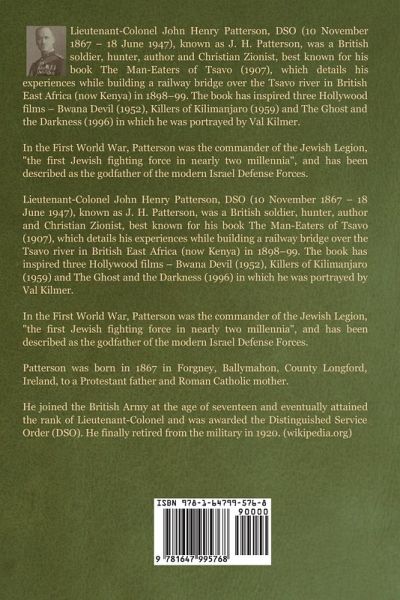 Lieutenant-Colonel John Henry Patterson, DSO (10 November 1867 – 18 June 1947), known as J. H. Patterson, was a British soldier, hunter, author and Christian Zionist, best known for his book The Man-Eaters of Tsavo (1907), which details his experiences while building a railway bridge over the Tsavo river in British East Africa (now Kenya) in 1898–99. The book has inspired three Hollywood films – Bwana Devil (1952), Killers of Kilimanjaro (1959) and The Ghost and the Darkness (1996) in which he was portrayed by Val Kilmer. In the First World War, Patterson was the commander of the Jewish Legion, "the first Jewish fighting force in nearly two millennia", and has been described as the godfather of the modern Israel Defense Forces. Lieutenant-Colonel John Henry Patterson, DSO (10 November 1867 – 18 June 1947), known as J. H. Patterson, was a British soldier, hunter, author and Christian Zionist, best known for his book The Man-Eaters of Tsavo (1907), which details his experiences while building a railway bridge over the Tsavo river in British East Africa (now Kenya) in 1898–99. The book has inspired three Hollywood films – Bwana Devil (1952), Killers of Kilimanjaro (1959) and The Ghost and the Darkness (1996) in which he was portrayed by Val Kilmer. In the First World War, Patterson was the commander of the Jewish Legion, "the first Jewish fighting force in nearly two millennia", and has been described as the godfather of the modern Israel Defense Forces. Patterson was born in 1867 in Forgney, Ballymahon, County Longford, Ireland, to a Protestant father and Roman Catholic mother. He joined the British Army at the age of seventeen and eventually attained the rank of Lieutenant-Colonel and was awarded the Distinguished Service Order (DSO). He finally retired from the military in 1920. (wikipedia.org)