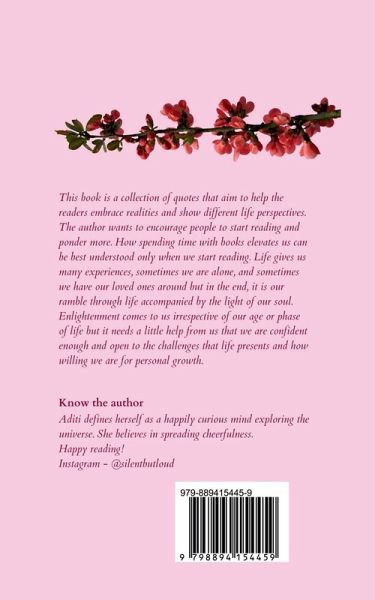 "With the Light of Soul" is a collection of quotes that aim to help the readers embrace realities and show different life perspectives. The author wants to encourage people to start reading and ponder more. How spending time with books elevates us can be best understood only when we start reading. Life gives us many experiences, sometimes we are alone, and sometimes we have our loved ones around but in the end, it is our ramble through life accompanied by the light of our soul. Enlightenment comes to us irrespective of our age or phase of life but it needs a little help from us that we are…mehr