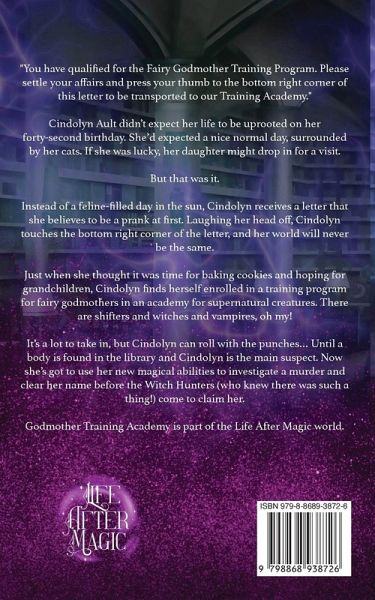 "You have qualified for the Fairy Godmother Training Program. Please settle your affairs and press your thumb to the bottom right corner of this letter to be transported to our Training Academy." Cindolyn Ault didn't expect her life to be uprooted on her forty-second birthday. She'd expected a nice normal day, surrounded by her cats. If she was lucky, her daughter might drop in for a visit. But that was it. Instead of a feline-filled day in the sun, Cindolyn receives a letter that she believes to be a prank at first. Laughing her head off, Cindolyn touches the bottom right corner of the letter, and her world will never be the same. Just when she thought it was time for baking cookies and hoping for grandchildren, Cindolyn finds herself enrolled in a training program for fairy godmothers in an academy for supernatural creatures. There are shifters and witches and vampires, oh my! It's a lot to take in, but Cindolyn can roll with the punches... Until a body is found in the library and Cindolyn is the main suspect. Now she's got to use her new magical abilities to investigate a murder and clear her name before the Witch Hunters (who knew there was such a thing!) come to claim her. Godmother Training Academy is part of the Life After Magic world.