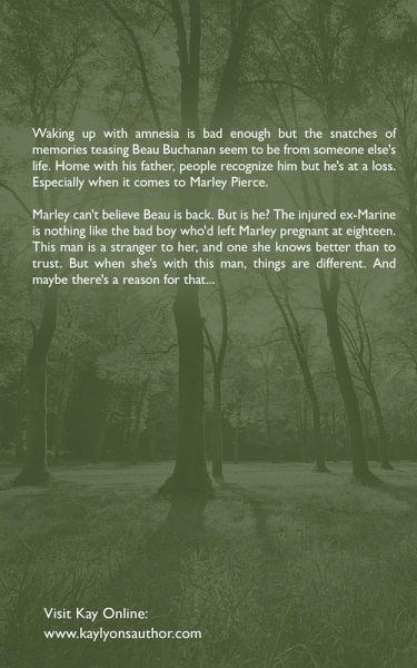 Waking up with amnesia is bad enough but the snatches of memories teasing Beau Buchanan seem to be from someone else's life. Home with his father, people recognize him but he's at a loss. Especially when it comes to Marley Pierce. Marley can't believe Beau is back. But is he? The injured ex-Marine is nothing like the bad boy who'd left Marley pregnant at eighteen. This man is a stranger to her, and one she knows better than to trust. But when she's with this man, things are different. And maybe there's a reason for that...