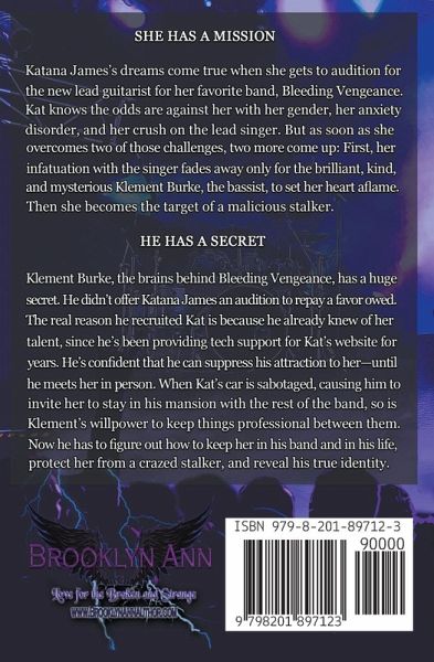 A struggle between business and pleasure is further challenged by secret identities and a malicious enemy. SHE HAS A MISSION Katana James's dreams come true when she gets to audition for the new lead guitarist for her favorite band, Bleeding Vengeance. Kat knows the odds are against her with her gender, her anxiety disorder, and her crush on the lead singer. But as soon as she overcomes two of those challenges, two more come up: First, her infatuation with the singer fades away only for the brilliant, kind, and mysterious Klement Burke, the bassist, to set her heart aflame. Then she becomes the target of a malicious stalker. HE HAS A SECRET Klement Burke, the brains behind Bleeding Vengeance, has a huge secret. He didn't offer Katana James an audition to repay a favor owed. The real reason he recruited Kat is because he already knew of her talent, since he's been providing tech support for Kat's website for years. He's confident that he can suppress his attraction to her-until he meets her in person. When Kat's car is sabotaged, causing him to invite her to stay in his mansion with the rest of the band, so is Klement's willpower to keep things professional between them. Now he has to figure out how to keep her in his band and in his life, protect her from a crazed stalker, and reveal his true identity.