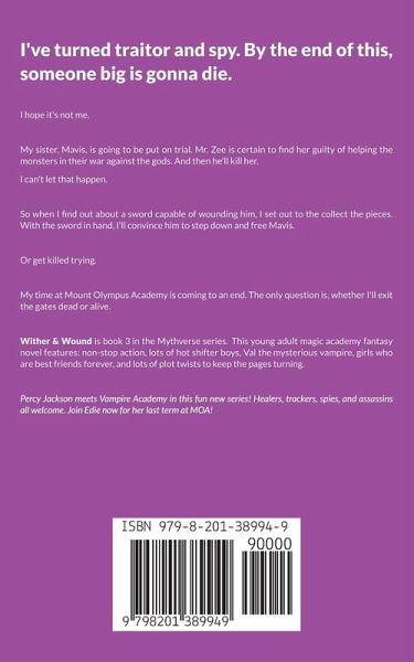 I've turned traitor and spy. By the end of this, someone big is gonna die. I hope it's not me. My sister, Mavis, is going to be put on trial. Mr. Zee is certain to find her guilty of helping the monsters in their war against the gods. And then he'll kill her. I can't let that happen. So when I find out about a sword capable of wounding him, I set out to the collect the pieces. With the sword in hand, I'll convince him to step down and free Mavis. Or get killed trying. My time at Mount Olympus Academy is coming to an end. The only question is, whether I'll exit the gates dead or alive. Wither & Wound is book 3 in the Mythverse series. This young adult magic academy fantasy novel features: non-stop action, lots of hot shifter boys, Val the mysterious vampire, girls who are best friends forever, and lots of plot twists to keep the pages turning. Percy Jackson meets Vampire Academy in this fun new series! Healers, trackers, spies, and assassins all welcome. Join Edie now for her last term at MOA!