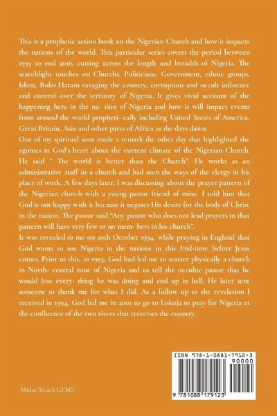This is a prophetic action book on the Nigerian Church and how it impacts the nations of the world. This particular series covers the period between 1993 to end 2016, cutting across the length and breadth of Nigeria. The searchlight touches on Churchs, Politicians, Government, ethnic groups, Islam, Boko Haram ravaging the country, corruption and occult influence and control over the territory of Nigeria. It gives vivid account of the happening here in the na- tion of Nigeria and how it will impact events from around the world propheti- cally including United States of America, Great Britain, Asia and other parts of Africa as the days dawn. One of my spiritual sons made a remark the other day that highlighted the agonies in God's heart about the current climate of the Nigerian Church. He said " The world is better than the Church". He works as an administrative staff in a church and had seen the ways of the clergy in his place of work. A few days later, I was discussing about the prayer pattern of the Nigerian church with a young pastor friend of mine. I told him that God is not happy with it because it negates His desire for the body of Christ in the nation. The pastor said "Any pastor who does not lead prayers in that pattern will have very few or no mem- bers in his church". It was revealed to me on 20th October 1994, while praying in England that God wants to use Nigeria in the nations in this End-time before Jesus comes. Prior to this, in 1993, God had led me to scatter physically a church in North- central zone of Nigeria and to tell the occultic pastor that he would lose every- thing he was doing and end up in hell. He later sent someone to thank me for what I did. As a follow up to the revelation I received in 1994, God led me in 2001 to go to Lokoja to pray for Nigeria at the confluence of the two rivers that traverses the country. It was while praying in room 12 at Confluence Motel Adankolo junction in Lokoja that He gave me the second name of the ministry The Jury Ministry and He told me to use it to kill and destroy what He has not allowed in the church and the nations. Jer.1:10. Between that 2001 and 2006, I have been led by God