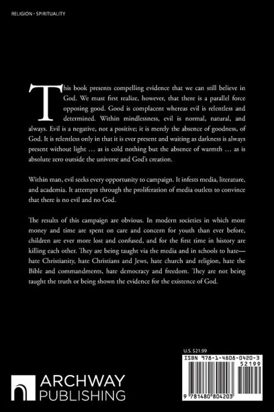 This book presents compelling evidence that we can still believe in God. We must ¿rst realize, however, that there is a parallel force opposing good. Good is complacent whereas evil is relentless and determined. Within mindlessness, evil is normal, natural, and always. Evil is a negative, not a positive; it is merely the absence of goodness, of God. It is relentless only in that it is ever present and waiting as darkness is always present without light ... as is cold nothing but the absence of warmth ... as is absolute zero outside the universe and God's creation. Within man, evil seeks every opportunity to campaign. It infests media, literature, and academia. It attempts through the proliferation of media outlets to convince that there is no evil and no God. The results of this campaign are obvious. In modern societies in which more money and time are spent on care and concern for youth than ever before, children are ever more lost and confused, and for the ¿rst time in history are killing each other. They are being taught via the media and in schools to hate-hate Christianity, hate Christians and Jews, hate church and religion, hate the Bible and commandments, hate democracy and freedom. They are not being taught the truth or being shown the evidence for the existence of God.