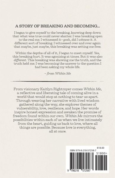 A story of breaking and becoming... I began to give myself to the breaking, knowing deep down that what was true could never shatter. I was breaking open to the real me. I witnessed it-gosh, did I witness it. A different sort of breaking. I witnessed over and over again that maybe, just maybe, this breaking was setting me free. Within the depths of all of it, I began to meet myself. Yes, this breaking hurt. It was agonizing at times. But it was also different. This breaking was showing me the truth, and the truth held me. I was becoming the answer to the question I had been asking my whole life. - from Within Me From visionary Kaitlyn Rightmyer comes Within Me, a reflective and liberating tale of coming alive in a world that would stop at nothing to tear us apart. Through weaving her narrative with lived wisdom gathered along the way, she explores themes of vulnerability, love, resilience, and hope. Her words inspire honest expression and awaken the promise of freedom found within our own. Within Me mirrors the possibilities within each of us when we live intimately from the heart, guiding us back to love, where all things are possible. Because love is everything, all at once.