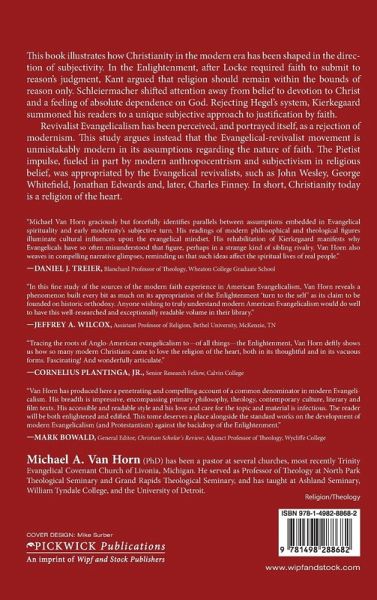 This book illustrates how Christianity in the modern era has been shaped in the direction of subjectivity. In the Enlightenment, after Locke required faith to submit to reason's judgment, Kant argued that religion should remain within the bounds of reason only. Schleiermacher shifted attention away from belief to devotion to Christ and a feeling of absolute dependence on God. Rejecting Hegel's system, Kierkegaard summoned his readers to a unique subjective approach to justification by faith. Revivalist Evangelicalism has been perceived, and portrayed itself, as a rejection of modernism. This study argues instead that the Evangelical-revivalist movement is unmistakably modern in its assumptions regarding the nature of faith. The Pietist impulse, fueled in part by modern anthropocentrism and subjectivism in religious belief, was appropriated by the Evangelical revivalists, such as John Wesley, George Whitefield, Jonathan Edwards, and, later, Charles Finney. In short, Christianity today is a religion of the heart. ""Michael Van Horn graciously but forcefully identifies parallels between assumptions embedded in evangelical spirituality and early modernity's subjective turn. His readings of modern philosophical and theological figures illuminate cultural influences upon the evangelical mindset. His rehabilitation of Kierkegaard manifests why evangelicals have so often misunderstood that figure, perhaps in a strange kind of sibling rivalry. Van Horn also weaves in compelling narrative glimpses, reminding us that such ideas affect the spiritual lives of real people."" --Daniel J. Treier, Blanchard Professor of Theology, Wheaton College Graduate School ""In this fine study of the sources of the modern faith experience in American Evangelicalism, Van Horn reveals a phenomenon built every bit as much on its appropriation of the Enlightenment 'turn to the self' as its claim to be founded on historic orthodoxy. Anyone wishing to truly understand modern American Evangelicalism would do well to have this well-researched and exceptionally readable volume in their library."" --Jeffrey A. Wilcox, PhD, Bethel University (Tennessee) ""Tracing the roots of Anglo-American evangelicalism to--of all things--the Enlightenment, Van Horn deftly shows us how so many modern Christians came to love the religion of the heart, both in its thoughtful and in its vacuous forms. Fascinating! And wonderfully articulate."" --Cornelius Plantinga Jr., Senior Research Fellow, Calvin College ""Van Horn has produced here a penetrating and compelling account of a common denominator in modern Evangelicalism. His breadth is impressive, encompassing primary philosophy, theology, contemporary culture, literary and film texts. His accessible and readable style and his love and care for the topic and material is infectious. The reader will be both enlightened and edified. This tome deserves a place alongside the standard works on the development of modern Evangelicalism (and Protestantism) against the backdrop of the Enlightenment."" --Mark Bowald, General Editor, Christian Scholar's Review; Adjunct Professor of Theology, Wycliffe College Michael A. Van Horn (PhD) has been a pastor at several churches, most recently Trinity Evangelical Covenant Church of Livonia, Michigan. He served as Professor of Theology at North Park Theological Seminary and Grand Rapids Theological Seminary, and has taught at Ashland Seminary, William Tyndale College, and the University of Detroit.