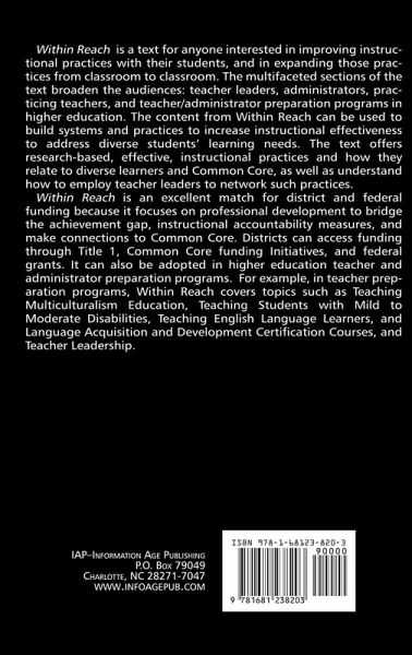 Within Reach is a text for anyone interested in improving instructional practices with their students, and in expanding those practices from classroom to classroom. The multifaceted sections of the text broaden the audiences: teacher leaders, administrators, practicing teachers, and teacher/administrator preparation programs in higher education. The content from Within Reach can be used to build systems and practices to increase instructional effectiveness to address diverse students' learning needs. The text offers research-based, effective, instructional practices and how they relate to diverse learners and Common Core, as well as to understand how to employ teacher leaders to network such practices. Within Reach is an excellent match for district and federal funding because it focuses on professional development to bridge the achievement gap, instructional accountability measures, and making connections to the Common Core. Districts can access funding through Title 1, Common Core funding initiatives, and federal grants. It can also be adopted in higher education teacher and administrator preparation programs. For example, in teacher preparation programs, Within Reach covers topics such as Teaching Multiculturalism Education, Teaching Students with Mild to Moderate Disabilities, Teaching English Language Learners, and Language Acquisition and Development Certification Courses, and Teacher Leadership.
