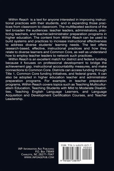 Within Reach is a text for anyone interested in improving instructional practices with their students, and in expanding those practices from classroom to classroom. The multifaceted sections of the text broaden the audiences: teacher leaders, administrators, practicing teachers, and teacher/administrator preparation programs in higher education. The content from Within Reach can be used to build systems and practices to increase instructional effectiveness to address diverse students' learning needs. The text offers research-based, effective, instructional practices and how they relate to diverse learners and Common Core, as well as to understand how to employ teacher leaders to network such practices. Within Reach is an excellent match for district and federal funding because it focuses on professional development to bridge the achievement gap, instructional accountability measures, and making connections to the Common Core. Districts can access funding through Title 1, Common Core funding initiatives, and federal grants. It can also be adopted in higher education teacher and administrator preparation programs. For example, in teacher preparation programs, Within Reach covers topics such as Teaching Multiculturalism Education, Teaching Students with Mild to Moderate Disabilities, Teaching English Language Learners, and Language Acquisition and Development Certification Courses, and Teacher Leadership.