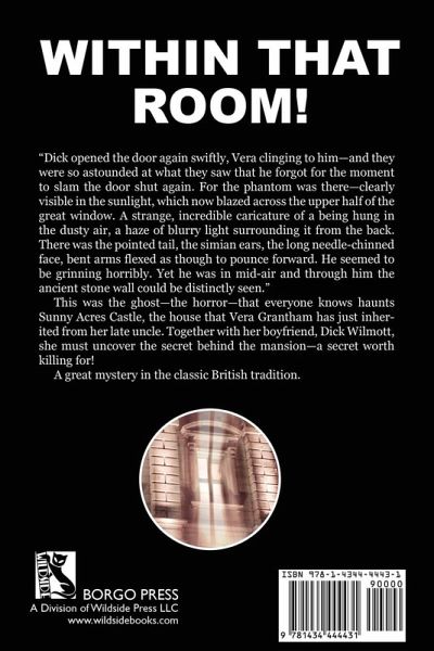 "Dick opened the door again swiftly, Vera clinging to him--and they were so astounded at what they saw that he forgot for the moment to slam the door shut again. For the phantom was there--clearly visible in the sunlight, which now blazed across the upper half of the great window. A strange, incredible caricature of a being hung in the dusty air, a haze of blurry light surrounding it from the back. There was the pointed tail, the simian ears, the long needle-chinned face, bent arms flexed as though to pounce forward. He seemed to be grinning horribly. Yet he was in mid-air and through him the ancient stone wall could be distinctly seen." This was the ghost--the horror--that everyone knows haunts Sunny Acres Castle, the house that Vera Grantham has just inherited from her late uncle. Together with her boyfriend, Dick Wilmott, she must uncover the secret behind the mansion--a secret worth killing for! A great mystery in the classic British tradition.