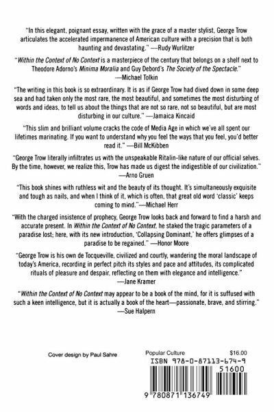 Written originally for a special issue of the New Yorker in 1978 and reissued here with a new Foreword by the author, Within the Context of No Context is George Trow's brilliant exposition on the state of American culture and 20th century life.