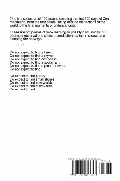 This is a collection of 100 poems covering the first 100 days of Zen meditation practice in the confines of a countryside Buddhist temple. These are not poems of enlightenment and peace or worldly observations. These are poems of struggle and discomfort. These are not poems of book learning and priestly discussions, but of simple observations sitting in meditation, eating in silence and cleaning the hallways. These are poems of celebration of a new world that any Buddhist practitioner will enjoy reading. Also, throughout the book are photos of Buddhist and Shinto temples in Japan. Neither the poems or photos are previously published.