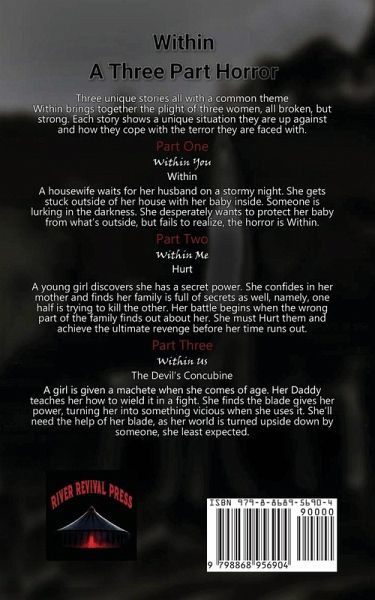 Three unique stories all with a common theme Within brings together the plight of three women, all broken, but strong. Each story shows a unique situation they are up against and how they cope with the terror they are faced with. Part One Within You Within A housewife waits for her husband on a stormy night. She gets stuck outside of her house with her baby inside. Someone is lurking in the darkness. She desperately wants to protect her baby from what's outside, but fails to realize, the horror is Within. Part Two Within Me Hurt A young girl discovers she has a secret power. She confides in her mother and finds her family is full of secrets as well, namely, one half is trying to kill the other. Her battle begins when the wrong part of the family finds out about her. She must Hurt them and achieve the ultimate revenge before her time runs out. Part Three Within Us The Devil's Concubine A girl is given a machete when she comes of age. Her Daddy teaches her how to wield it in a fight. She finds the blade gives her power, turning her into something vicious when she uses it. She'll need the help of her blade, as her world is turned upside down by someone, she least expected.