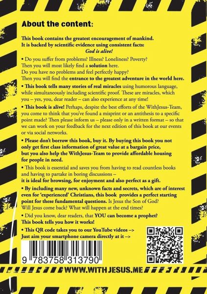 Also this book of the WithJesus-Team is, dear readers, YOUR ENTRY - scientifically proven and verifiable - to humanity's greatest adventure!For amazement and hope, personally experienced, directly to the miracle of Jesus Christ - free from religious traditions and legalities!And anyone who buys this book (and the WithJesus-Team's products) will directly help people in crisis situations find affordable housing - the charitable work of the WithJesus-Team!Living with Jesus: the greatest adventure in the world!