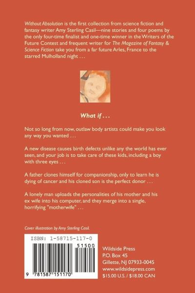 "Without Absolution" is the first collection from science-fiction and fantasy writer Amy Sterling Casil. It contains nine stories and four poems in which a new disease causes birth defects; a father clones himself; and a lonely man uploads the personalities of his former wife and his mother, creating a horrifying "motherwife".