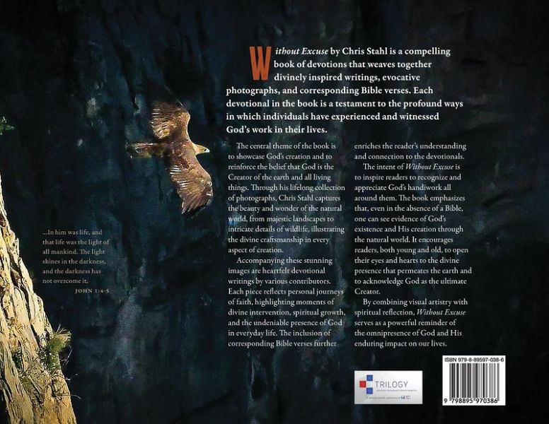 Without Excuse by Chris Stahl is a compelling book of devotions that weaves together divinely inspired writings, evocative photographs, and corresponding Bible verses. Each devotional in the book is a testament to the profound ways in which individuals have experienced and witnessed God's work in their lives. The central theme of the book is to showccase God's creation and to reinforce the belief that God is the Creator of the earth and all living things. Through is lifelong collection of photographs, Chris Stahl captures the beauty and wonder of the natural world, from majestic landscapes to intricate details of wildlife, illustrating the divine craftsmanship in every aspect of creation. Accompanying these stunning images are heartfelt devotional writings by various contributors. Each piece reflects personal journeys of faith, highlighting moments of divine intervention, spiritual growth, and the undeniable presence of God in everyday life. The inclusion of corresponding Bible verses further enriches the reader's understanding and connection to the devovtionals. The intent of Without Excuse is to inspire readers to recognize and appreciate God's handiwork all around them. The book emphasizes that, even in the absence of a Bible, one can see the evidence of God's existence and His creation through the natural world. It encourages readers, both young and old, to open their eyes and hearts to the divine presence that permeates the earth and acknowledge God as the ultimate Creator. By combining visual artistry with spiritual reflection, Without Excuse serves as a powerful reminder of the omnipresence of God and His enduring impact on our lives.