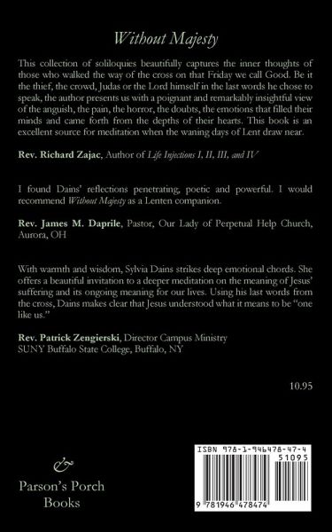 This is an unusual rendering of the Seven Last Words in that it concentrates more on the humanity of Jesus: in his use of contemporary language, in his expressions of anguish as he begs the Father’s mercy, in his triumph over his own human doubting and his final letting go in full trust, turning over his spirit to the infinite Mercy he always knew awaited him. My rationale comes from the Eucharistic prayer that describes him as "one like us in all things but sin". I took that to imply that even Jesus -- God though he was -- could be subject to uncertainty at times, to hurt feelings when friends disappointed him, to times of impatience, anger, loss, frustration and ambivalence.