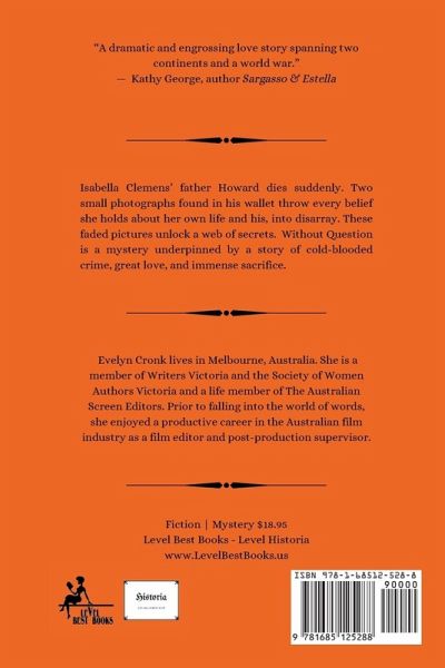Isabella Clemens' father Howard dies suddenly. Two small photographs found in his wallet throw every belief she holds about her own life and his, into disarray. These faded pictures unlock a web of secrets. Without Question is a mystery underpinned by a story of cold-blooded crime, great love, and immense sacrifice.