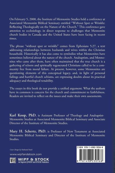 On February 5, 2000, the Institute of Mennonite Studies held a conference at Associated Mennonite Biblical Seminary entitled ""Without Spot or Wrinkle: Reflecting Theologically on the Nature of the Church."" This conference gave attention to ecclesiology, in direct response to challenges that Mennonite church bodies in Canada and the United States have been facing in recent times. The phrase ""without spot or wrinkle"" comes from Ephesians 5:27, a text addressing relationships between husbands and wives within the Christian household. Historically it has also come to symbolize what Mennonites have sometimes believed about the nature of the church. Anabaptists, and Mennonites who came after them, have often maintained that the true church is a gathering of reborn and spiritually regenerated Christians called to be a community free from moral failure. At present, however, some Mennonites are questioning elements of this conceptual legacy, and, in light of personal failings and hurtful church schisms, are expressing doubts about its practical adequacy and theological tenability. The essays in this book do not provide a unified argument. What the authors have in common is concern for the church and commitment to faithfulness. Readers are invited to reflect on the issues and make their own assessments.