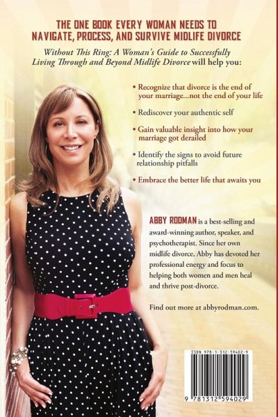Midlife divorce is skyrocketing and women are initiating divorce in higher numbers than ever before in history. Psychotherapist and relationship expert Abby Rodman surveyed hundreds of women who divorced in midlife to find out the whys, whats and hows of their experiences. Packed with personal stories, fascinating statistics, helpful checklists, expert advice and practical tips, Without This Ring is a necessary and critical read at any stage of midlife divorce - whether you're just starting to consider it or you've already come out the other side. Abby Rodman is a psychotherapist, blogger, and Amazon bestselling author who has successfully lived through and beyond her own midlife divorce. She has appeared on the Today Show, HuffPost Live, and is regularly sought out by major media outlets for her expertise on relationship and parenting issues. Her podcast, Relationships with Abby Rodman, can be downloaded on iTunes.
