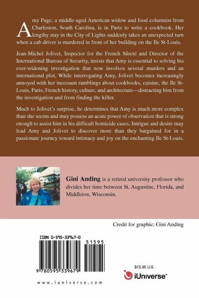 Amy Page, a middle-aged American widow and food columnist from Charleston, South Carolina, is in Paris to write a cookbook. Her lengthy stay in the City of Lights suddenly takes an unexpected turn when a cab driver is murdered in front of her building on the Ile St-Louis. Jean-Michel Jolivet, Inspector for the French Sûreté and Director of the International Bureau of Security, insists that Amy is essential to solving his ever-widening investigation that now involves several murders and an international plot. While interrogating Amy, Jolivet becomes increasingly annoyed with her incessant ramblings about cookbooks, cuisine, the Ile St-Louis, Paris, French history, culture, and architecture--distracting him from the investigation and from finding the killer. Much to Jolivet's surprise, he determines that Amy is much more complex than she seems and may possess an acute power of observation that is strong enough to assist him in his difficult homicide cases. Intrigue and desire may lead Amy and Jolivet to discover more than they bargained for in a passionate journey toward intimacy and joy on the enchanting Ile St-Louis.