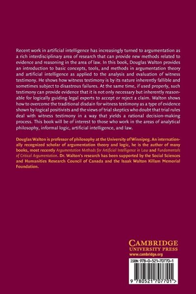 Recent work in artificial intelligence has increasingly turned to argumentation as a rich, interdisciplinary area of research that can provide new methods related to evidence and reasoning in the area of law. Douglas Walton provides an introduction to basic concepts, tools and methods in argumentation theory and artificial intelligence as applied to the analysis and evaluation of witness testimony. He shows how witness testimony is by its nature inherently fallible and sometimes subject to disastrous failures. At the same time such testimony can provide evidence that is not only necessary but inherently reasonable for logically guiding legal experts to accept or reject a claim. Walton shows how to overcome the traditional disdain for witness testimony as a type of evidence shown by logical positivists, and the views of trial sceptics who doubt that trial rules deal with witness testimony in a way that yields a rational decision-making process.