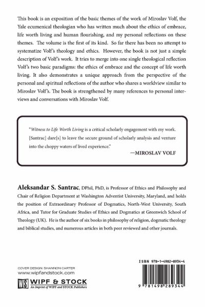 This book is an exposition of the basic themes of the work of Miroslav Volf, the Yale ecumenical theologian who has written much about the ethics of embrace, life worth living and human flourishing, and my personal reflections on these themes. The volume is the first of its kind. So far there has been no attempt to systematize Volf's theology and ethics. However, the book is not just a simple description of Volf's work. It tries to merge into one single theological reflection Volf's two basic paradigms: the ethics of embrace and the concept of life worth living. It also demonstrates a unique approach from the perspective of the personal and spiritual reflections of the author who shares a worldview similar to Miroslav Volf's. The book is strengthened by many references to personal interviews and conversations with Miroslav Volf.