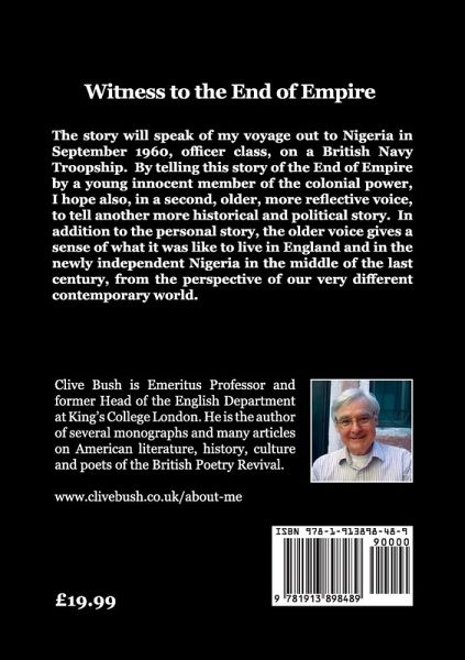 The story will speak of my voyage out to Nigeria in September 1960, officer class, on a British Navy Troopship. By telling this story of the End of Empire by a young, innocent member of the colonial power, I also hope, in a second, older, more reflective voice, to tell another more historical and political story. In addition to the personal story, the older voice gives a sense of what it was like to live in England and in the newly independent Nigeria in the middle of the last century from the perspective of our very different contemporary world.